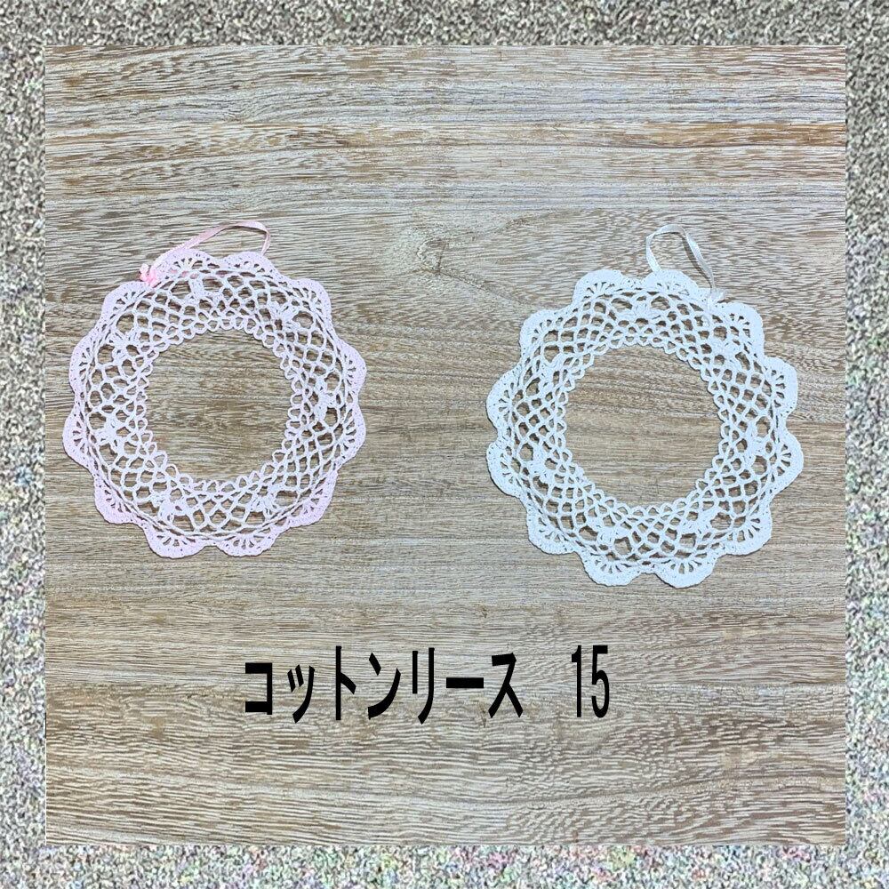 コットンリース 15 2枚セット 約15.5㎝ ホワイトとピンクの2色 レース編みしたコットンを樹脂加工してあります。 表中央が膨らんでます。 プリザーブドフラワー、ドライフラワー、造花などのアレンジベース、 そのままインテリアとして飾ったり、用途いろいろです。 染色塗料等で染められますので、好みや季節に合わせてオリジナルな物を作ってみてはいかがでしょうか。 在庫限りです。 ※プリザーブドフラワー液等色移りすることがあります。