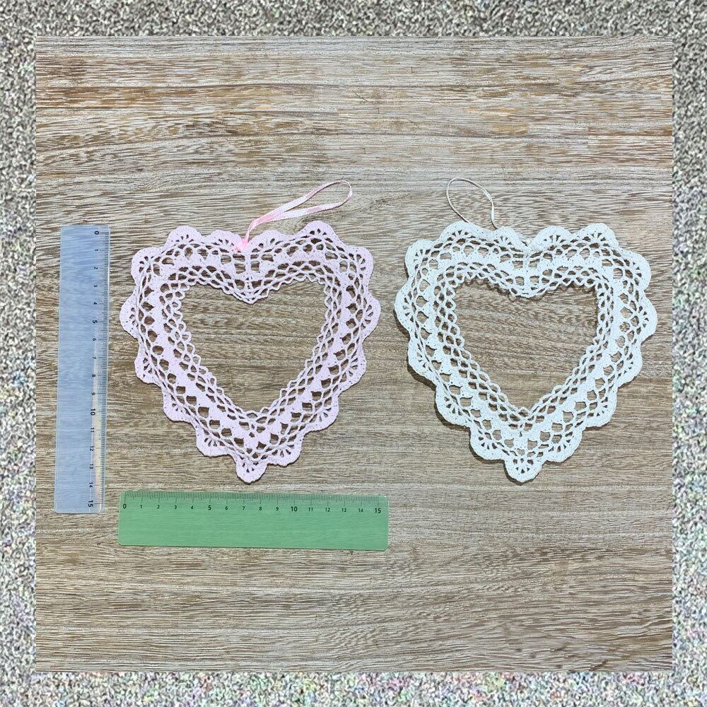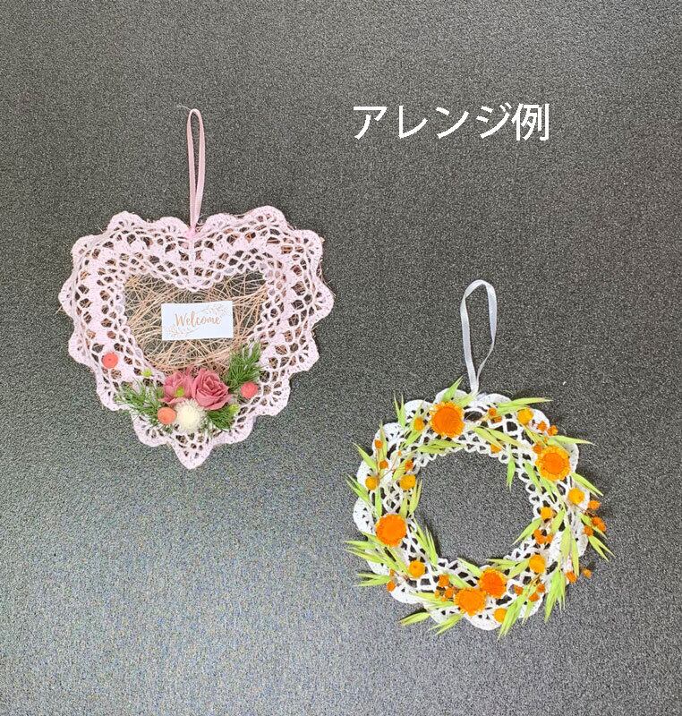 コットンハートリース 15 2枚セット 幅約15㎝ 高さ約14㎝ ホワイト ピンク の2色 レース編みしたコットンを樹脂加工してあります。 表中央が膨らんでます。 プリザーブドフラワー、ドライフラワー、造花などのアレンジベース、 そのままインテリアとして飾ったり、用途いろいろです。 染色塗料等で染められますので、好みや季節に合わせてオリジナルな物を作ってみてはいかがでしょうか。 在庫限りです。 ※プリザーブドフラワー液等色移りすることがあります。