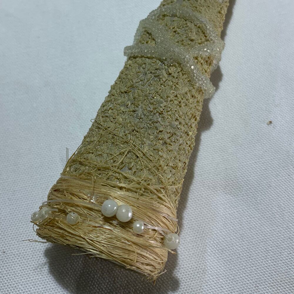 縁にはサイザルを巻きつけて、ビースの装飾を施してある商品です。